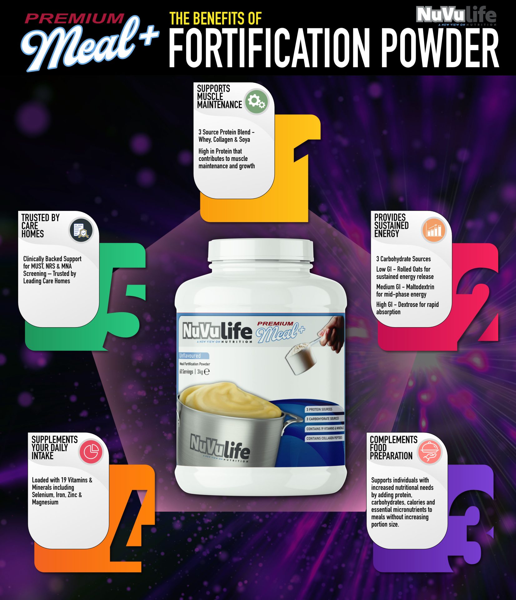 Meal+ provides a quick and easy way to increase the nutrient and calorie content of a meal without increasing volume. NuVu Life Meal+ is an unflavoured version of our bestselling NuVu Life flavoured shakes and has been formulated specifically for meal fortification.